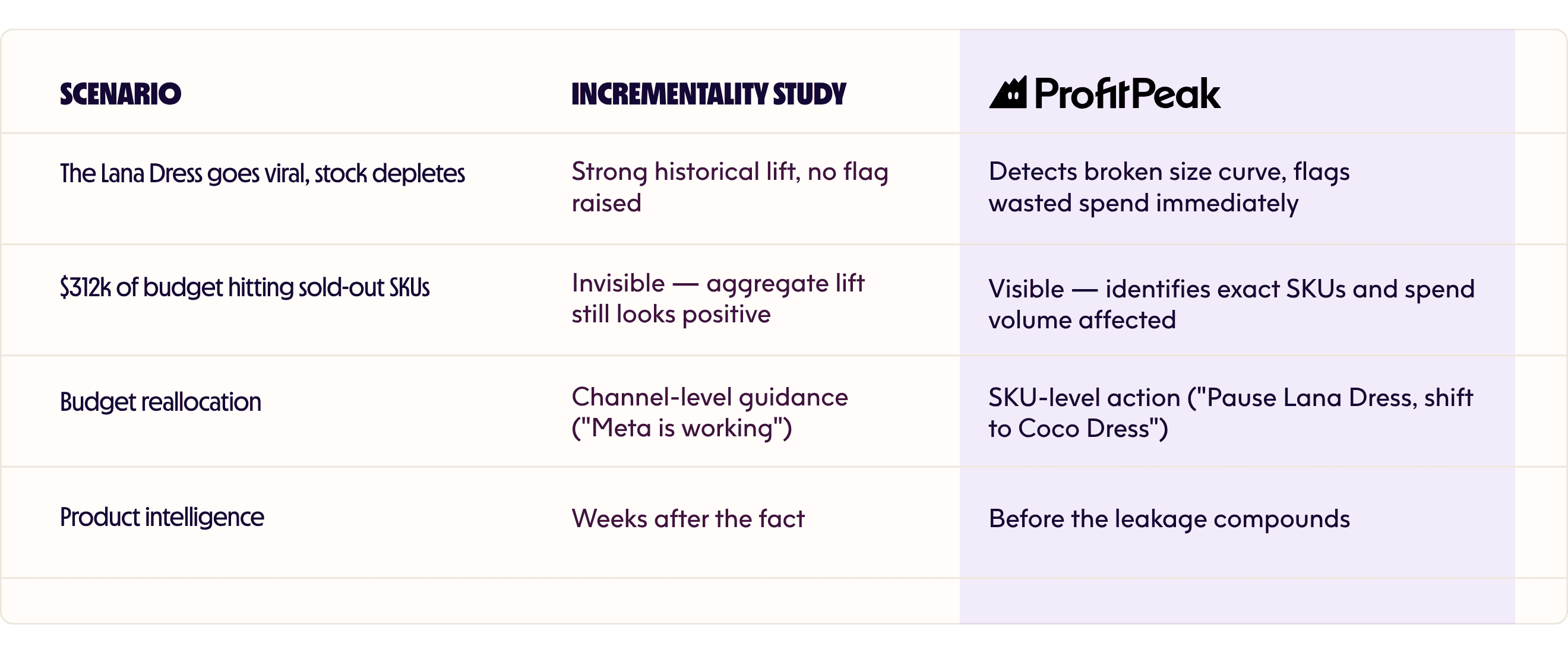 Any study built on historical lift data is telling you what was true weeks ago. In a high-velocity e-commerce environment, a product can go from hero to fully depleted in days. By the time a study confirms your spend is working, your best-selling sizes may already be gone. ProfitPeak uses inventory as a leading signal, so you get a warning before efficiency drops rather than a post-mortem after it already has.