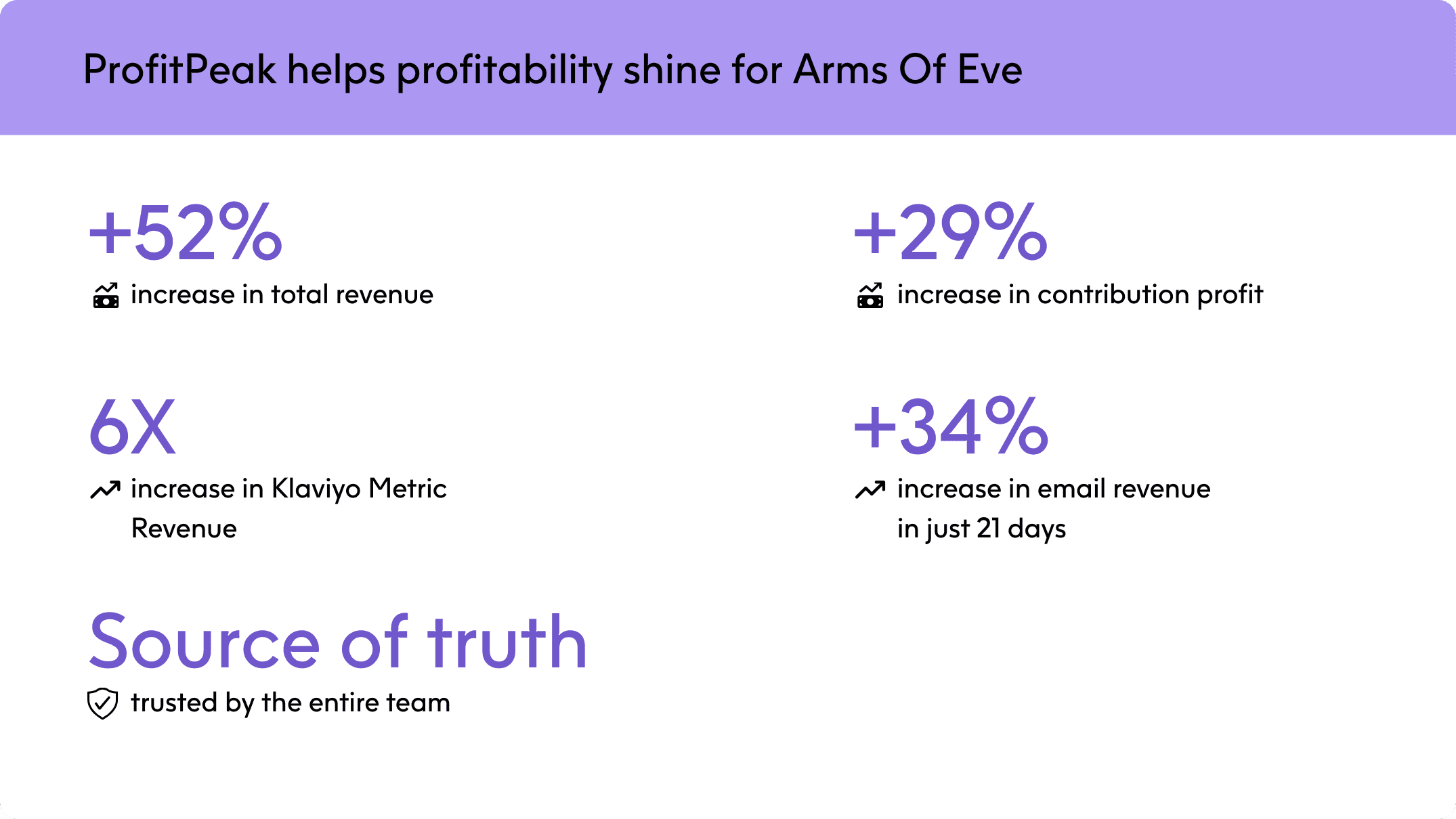 Real-time Profit Optimisation: ProfitPeak transformed raw data into actionable insights, showing Arms of Eve their true profit margins on every product and campaign.