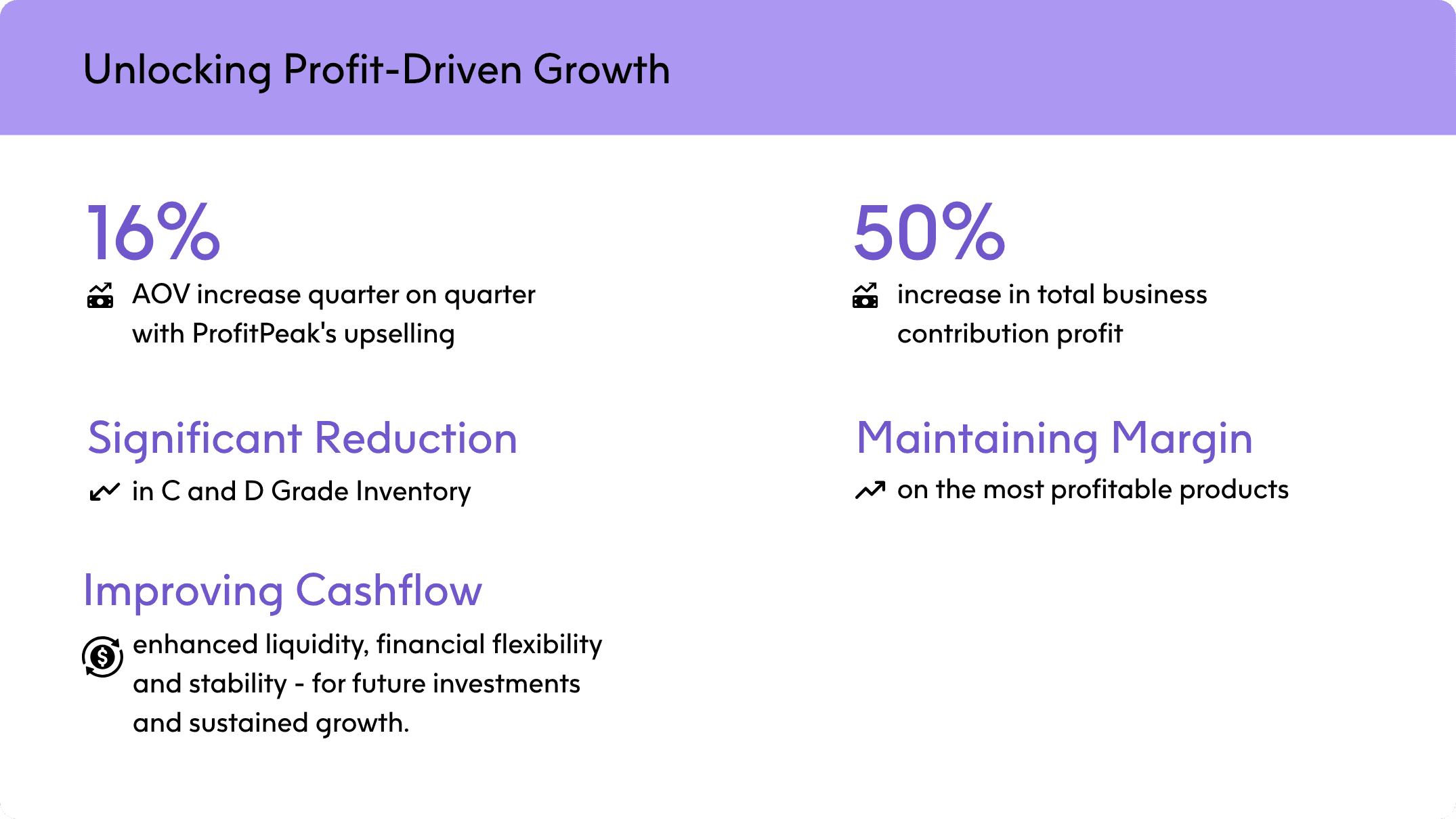 The solution for Cachia lay in the combined power of ProfitPeak’s platform and Ecom Nation’s strategic execution. ProfitPeak provided the granular, real-time data and predictive analytics necessary to identify which products were truly profitable, which were underperforming, and how discounting strategies would impact overall margin and inventory levels. The platform's inventory forecasting capabilities were instrumental in understanding the optimal levels of C and D grade stock to clear, while protecting the more valuable A and B grade inventory.
